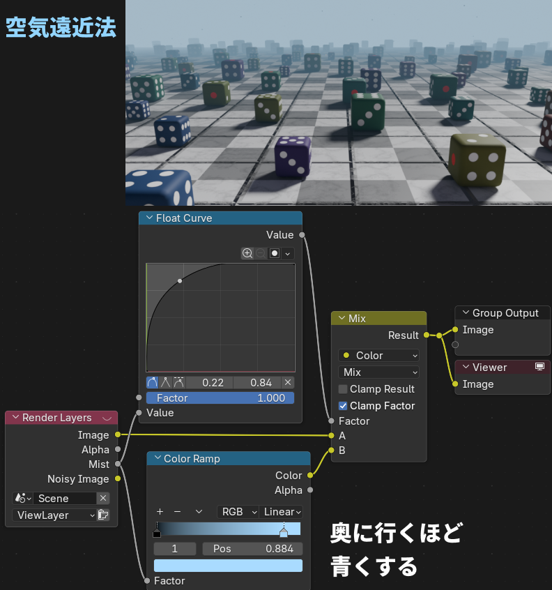 Mistパス出力を使い、奥に行くほど青味を乗せて空気遠近法のような効果を得ることができます。MixノードBのカラーに、Color RampノードをはさんだMistパスを接続します。