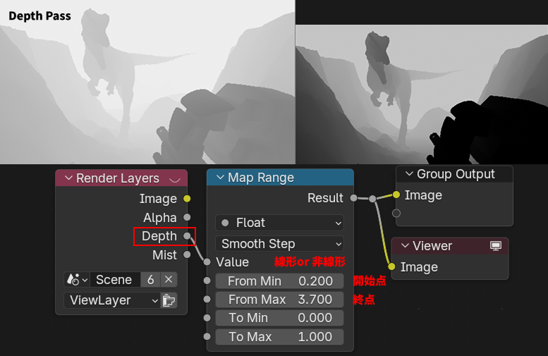 Depthパスはミストパスと違い、カメラからの距離をそのまま数値として出しています。なので、すぐ1以上になるためほぼ白いグラデーション画像が出力されています。