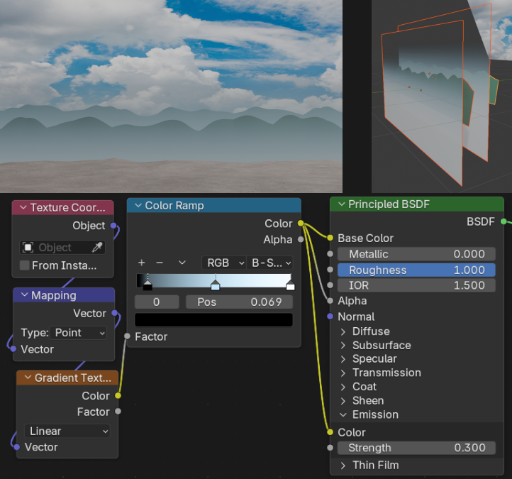 - MistパスにFloat CurveノードをはさんでMixノードのFactorに接続