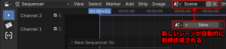 ビデオ編集を始めるにあたり、Video Editing画面のSequencerでNewを押すと、新しくビデオ編集用のシーンが1つ作成されます。(ただの空のシーンなので自分で増やすこともできます。MasterでもVideo Editでも好きな名前をつけて使用してください。)