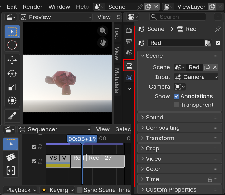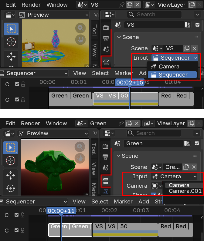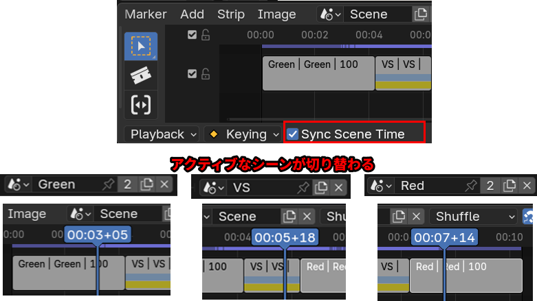 このように、それぞれのシーンのプロパティ設定を変更したいとき、Sync Scene Timeを有効にしていると、わざわざアクティブなシーンを変更しなくても、そのストリップが再生されているときに設定を変更するだけでよくなり、効率的に作業できます。