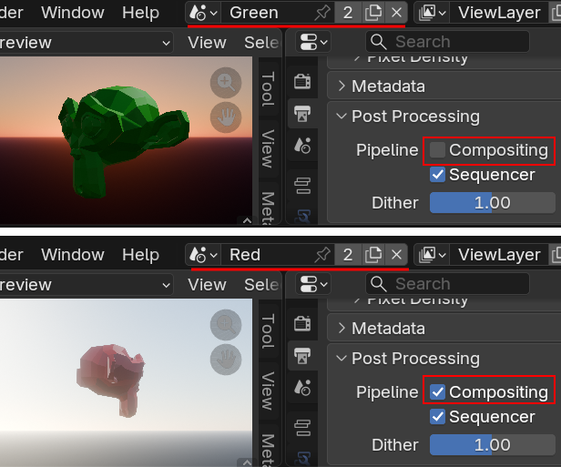 Green, Redのシーンはどちらもコンポジット作業をしてグレアをつけています。Greenのシーンだけコンポジットをせずに出力したい場合、