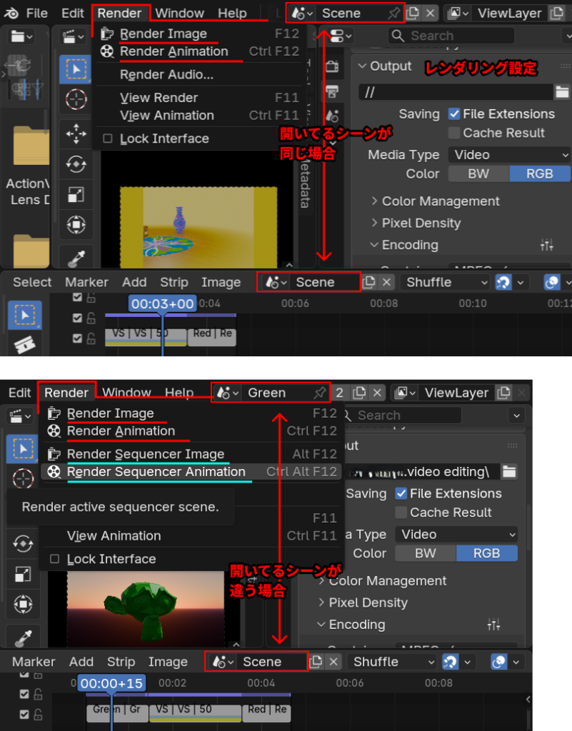 再生やレンダリングは、どのエディターから操作しているか、どのシーンがアクティブかによって挙動が変わります。