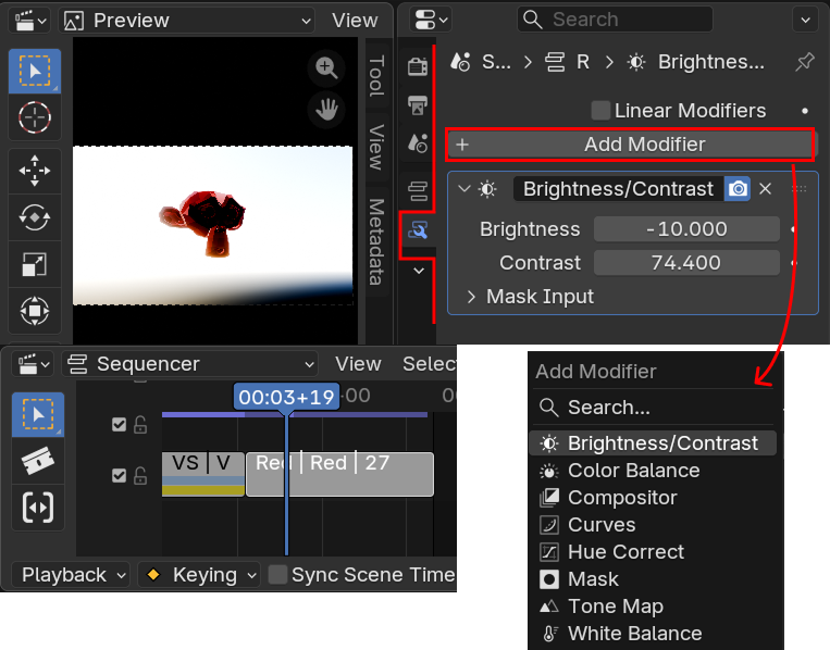 モディファイアを追加するときも、ストリップを選択すれば、アクティブシーンに関係なく編集できます。