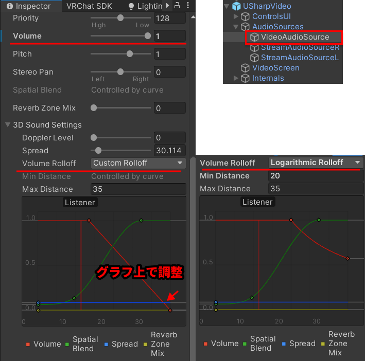 USharpVideo > AudioSource > VideoAudioSource のAudio Sourceコンポーネントには音量の減衰について設定できる項目があります。