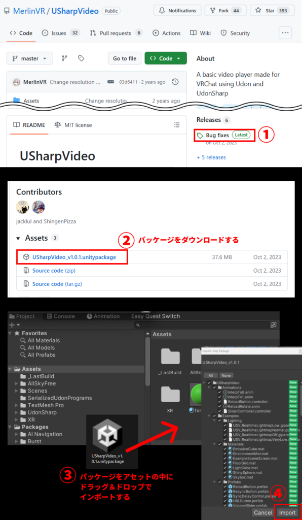 - 下の方のAssetsの中のUsharpVideoと書いてあるUnitypackageを押してダウンロードします。(少し時間がかかります)