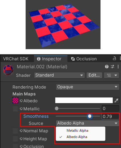 設定してみると、実際チェックの青い部分にだけ光が反射しています。狙った通りにSmoothnessが効いています。