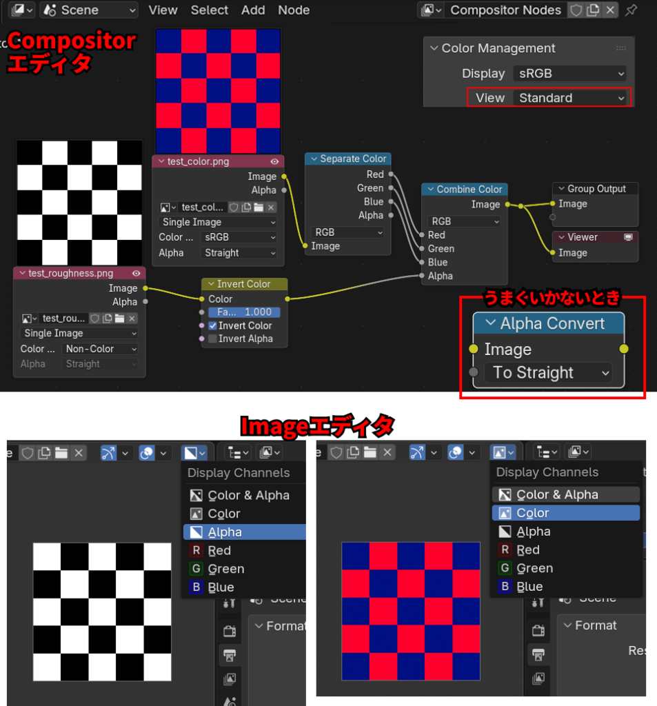 Blenderでのベイク処理も、この Premultiplied 前提の扱いが影響しているため、RGB と無関係なデータをアルファにそのまま焼くことができませんでした。