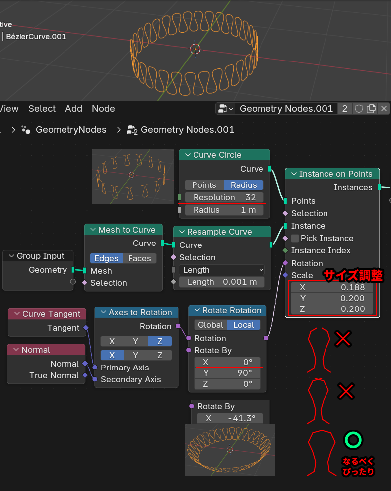 • 円の半径Curve CircleノードのRadiusの数値