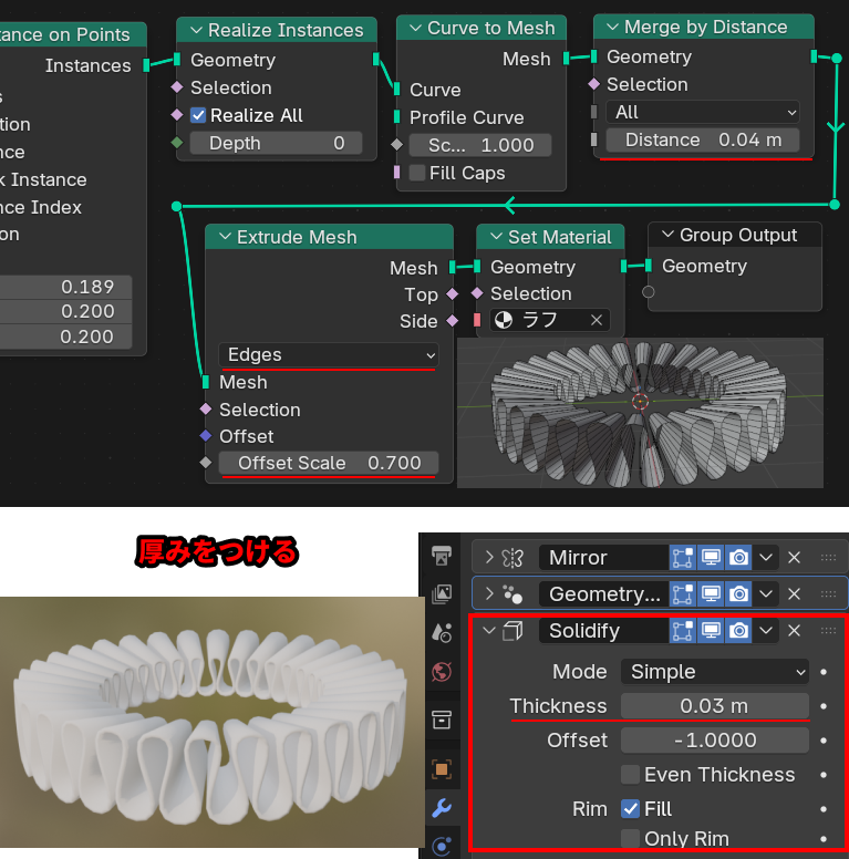 • Merge by Distanceノードは、まだ接続できてない頂点をつなげるためにつけています。途中でメッシュがきちんとつながってないなと思ったらこの値を調整してみてください。