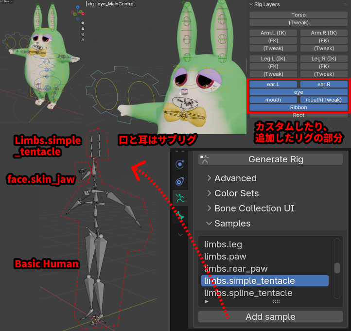 この記事は、BlenderのRigifyにカスタムの顔リグなどを追加する方法を解説している中級~上級者向けの記事です。