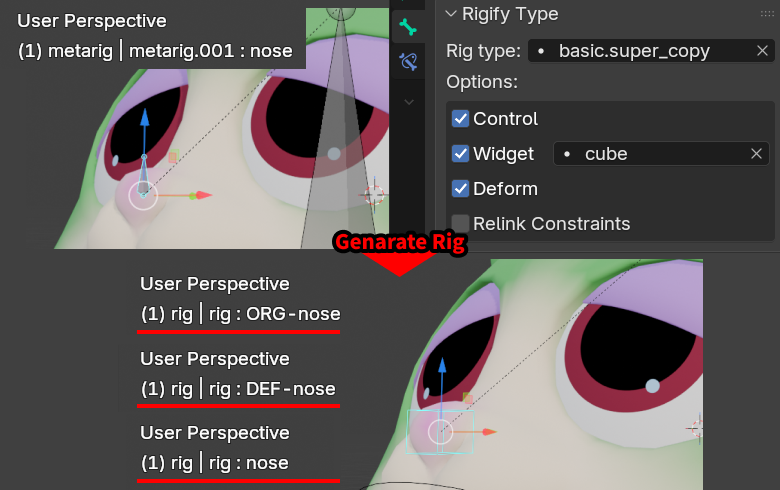 Rigifyの身体部分だけは使いたいけど顔部分はちょっとカスタムしたいよという方にオススメの方法です。