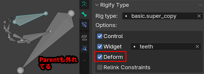 デフォルトで、歯の変形ボーンがありません。なので、歯を作るときは、サブリグのオプションでDeformにチェックを入れてください。