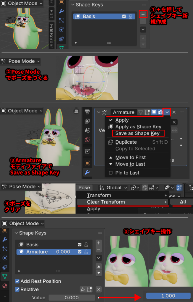- リグ操作によってメッシュを変形させ、それをシェイプキーとして登録する方法