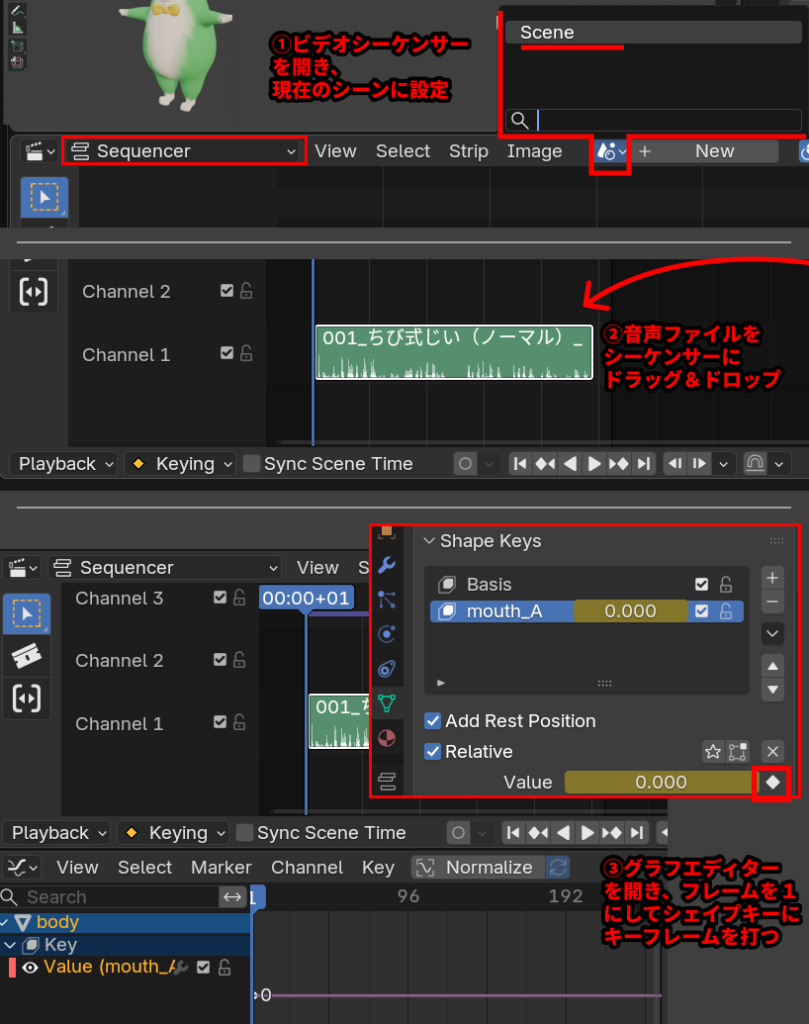 これで音声とシェイプキーアニメを連動させる準備ができました。