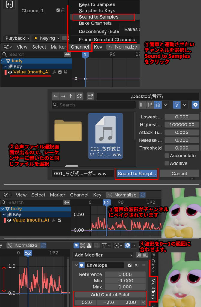 (ただ、音の強さによって波形がベイクされるので、値が0~1の範囲にならず、口の開きが小さくなりがちです。) - そのため、波形を0~1の範囲に収めます。