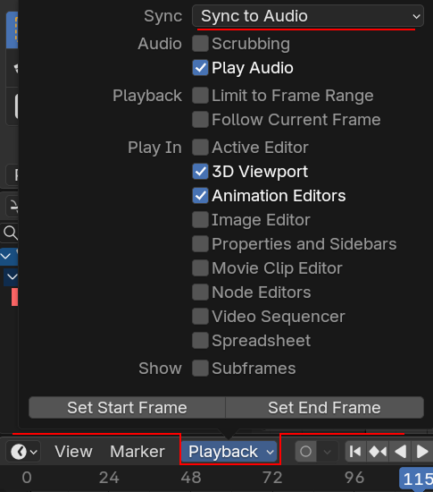 タイムラインの Playback > Sync を