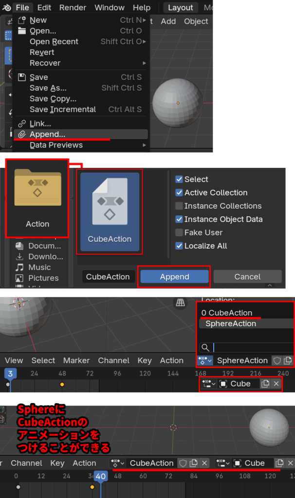 アクション自体もデータブロックであるため、他の .blend ファイルに簡単にアペンド(追加)したりリンクしたりできます。
