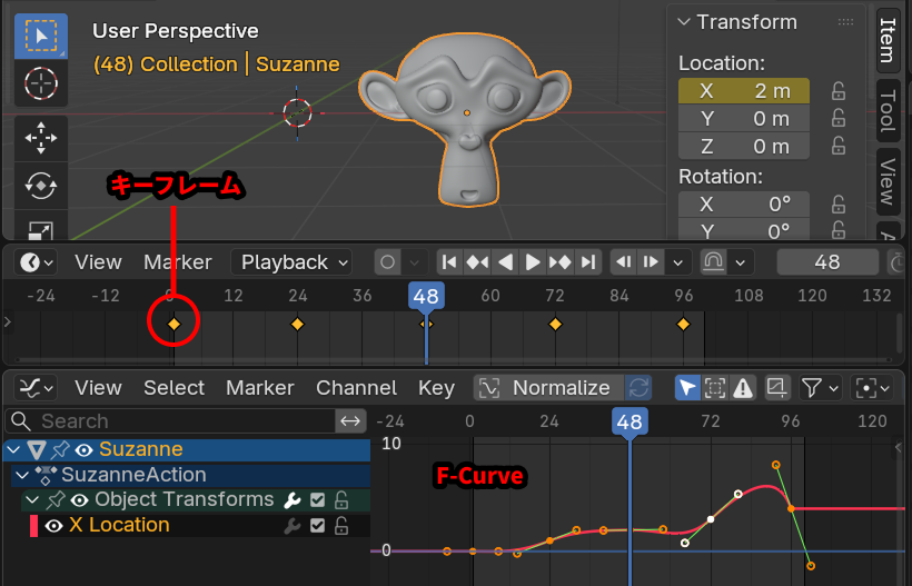 F-Curveは、Blenderにおけるアニメーションの基本単位です。