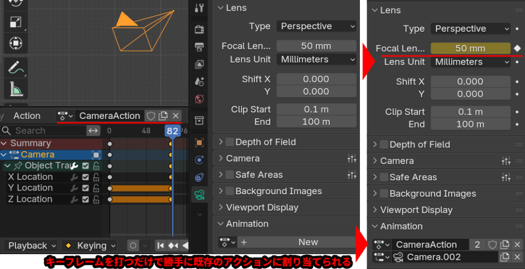 同じデータブロックのアニメーションを作成する場合は、自動で既存のアクションに割り当てられないためにもなるべく手動で割り当てた方が安全です。