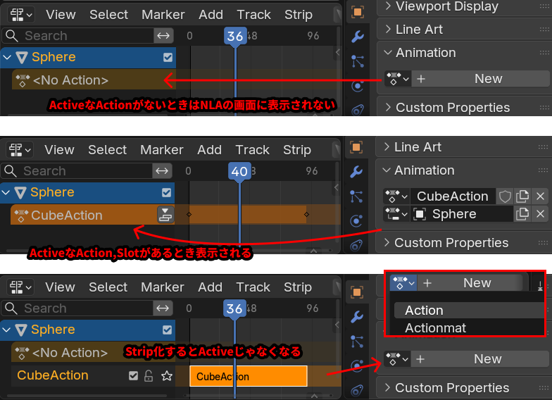 ちなみに、このようにいきなり消えないようにするためか、Blenderが勝手にアクションをストリップ化して、アクションが消えないようにすることがあります。消したいのにアクションが消えないときはNLAエディタをチェックしてみてください。