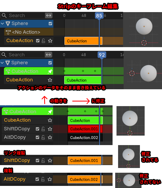 例えばオブジェクトを複製するときは、Shift + Dがただの複製、Alt + Dがリンク複製になっています。エディタによってコマンドが違うので注意してください。(NLAでストリップを複製するときは普通アクションを参照したいだろうということで、ユーザーが慣れてよく使うShift + Dにリンク複製を割り当ててるんだと思います。)