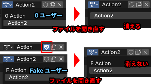 これを防ぐために、使わないアクションには、盾のようなアイコンをクリックしてフェイクユーザー(Fake User)化する方法があります。