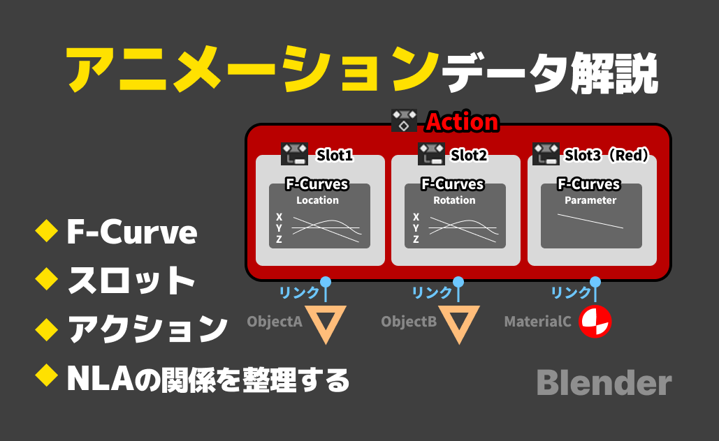 この記事は、Blenderのアニメーションデータ(キーフレーム(Keyframe)、F-Curve(Fカーブ)、アクション(Action)、スロット(Slot))についてまとめている中級者向けの記事です。