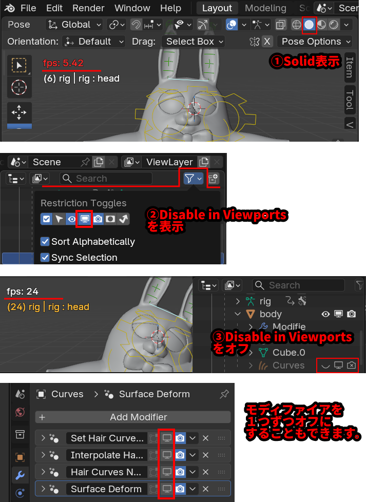 - アウトライナーの、処理が重そうなモディファイアのついたオブジェクトのDisable in Viewportsをオフにします。(目のアイコンもオフにして不可視化しておいた方がいいです。)