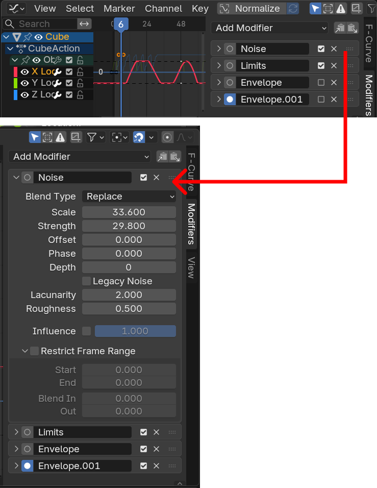 F-Curveモディファイアは、既存のキーフレームアニメーションに対して後から効果を加えられる便利な機能です。