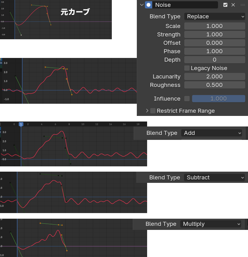 この記事は、BlenderのF-Curve Modifiers(Fカーブモディファイア)を紹介、パラメータなど解説している初級~中級者向けの記事です。