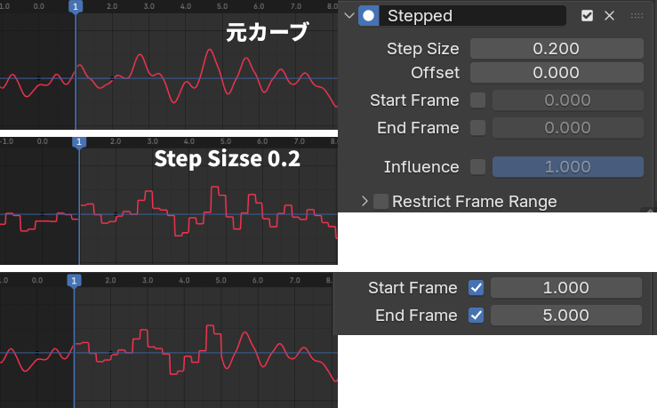 - Stepped Interpolation(ステップ補間)…カーブを「カクカク(段階的)」な動きにする。