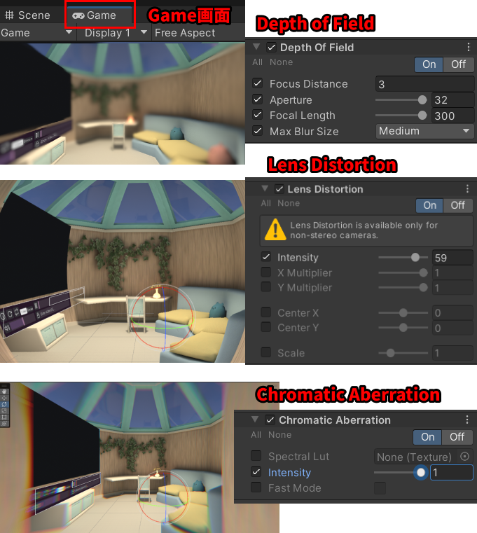 また、カメラから見た画面からでないと効果が見えないエフェクトもある(例:Depth of Fieldなど)ので、その場合はGameタブから見てください。