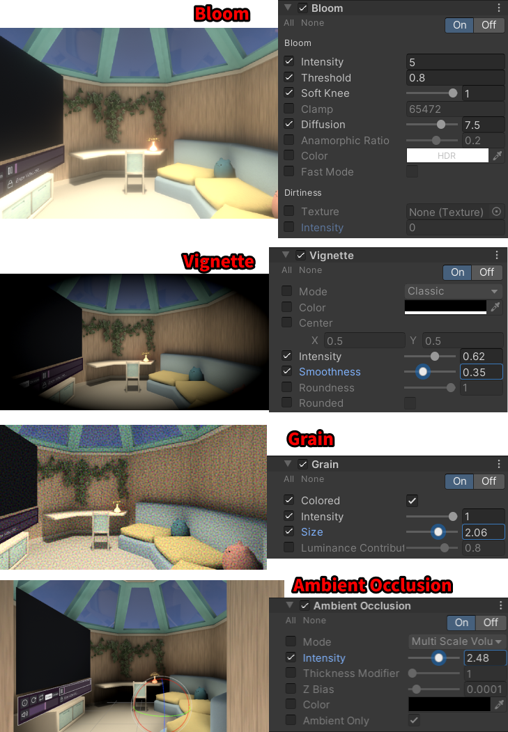 Unityでは、ポストプロセシングを使うことで次のような表現が可能です: