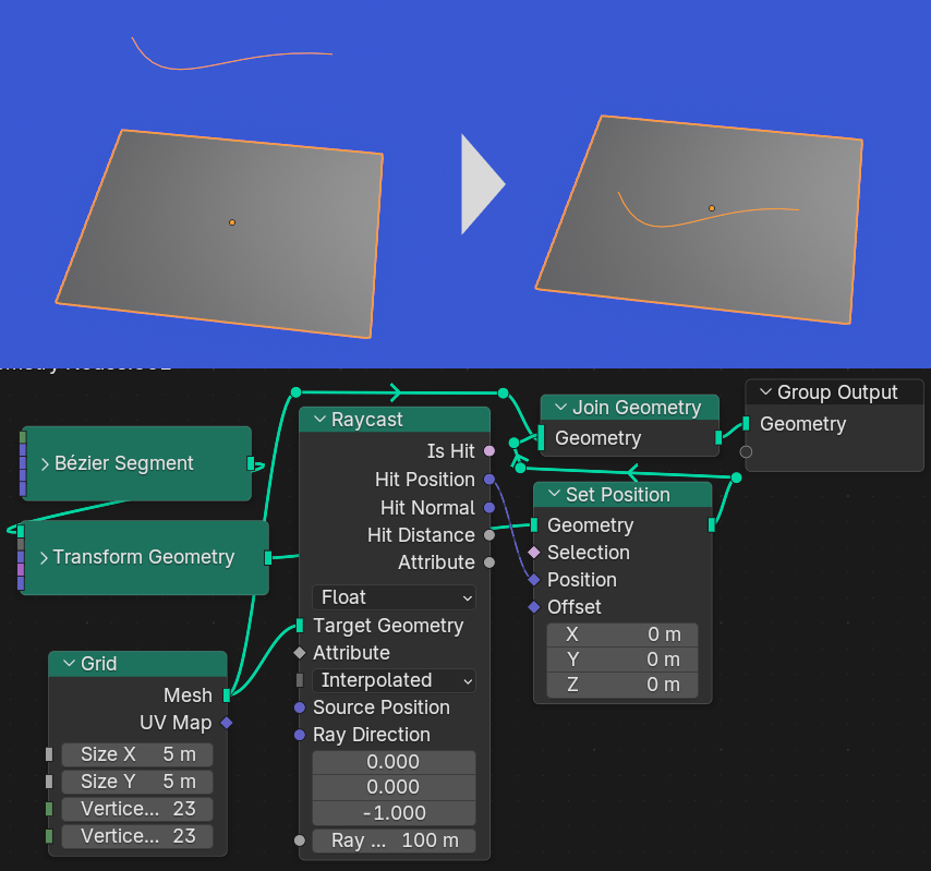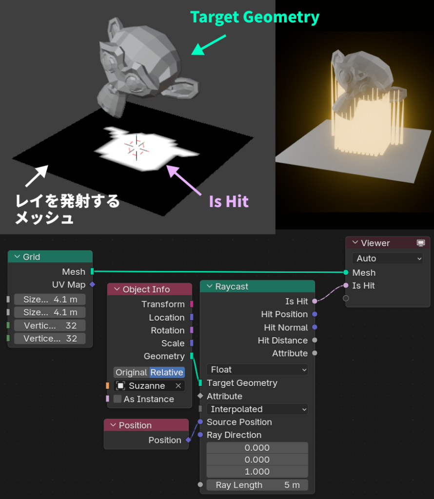 あるジオメトリからレイ(光線)を飛ばして、別のジオメトリに当たるか調べるノードです。