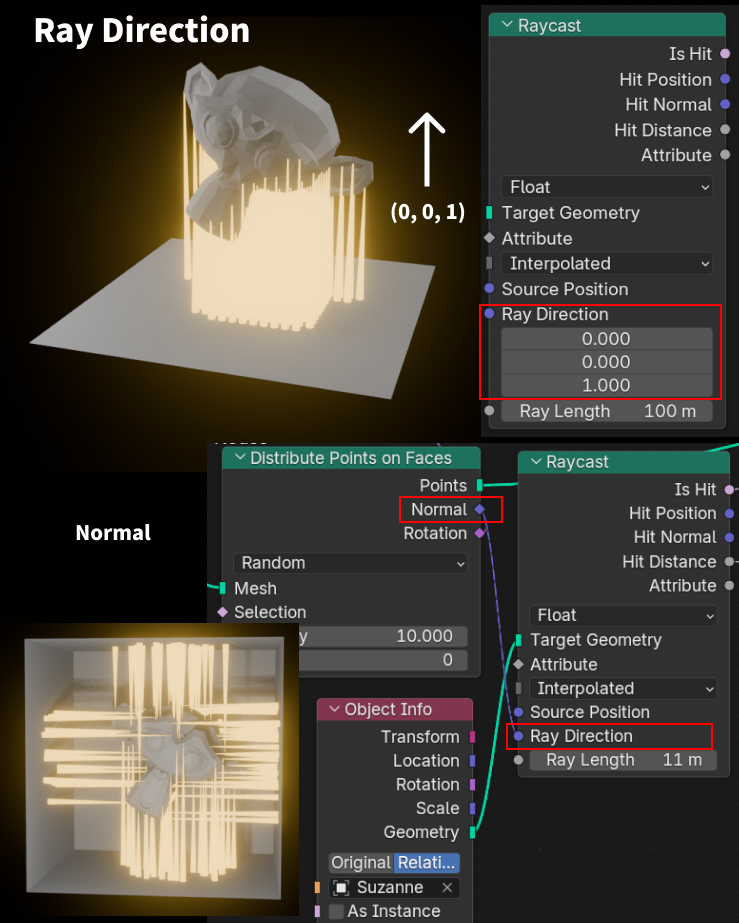 ※ちなみに、画像では可視化していませんが、平面のジオメトリの全ての点からレイが出ていて、当たってないものはRay Lengthの長さまで伸びています。